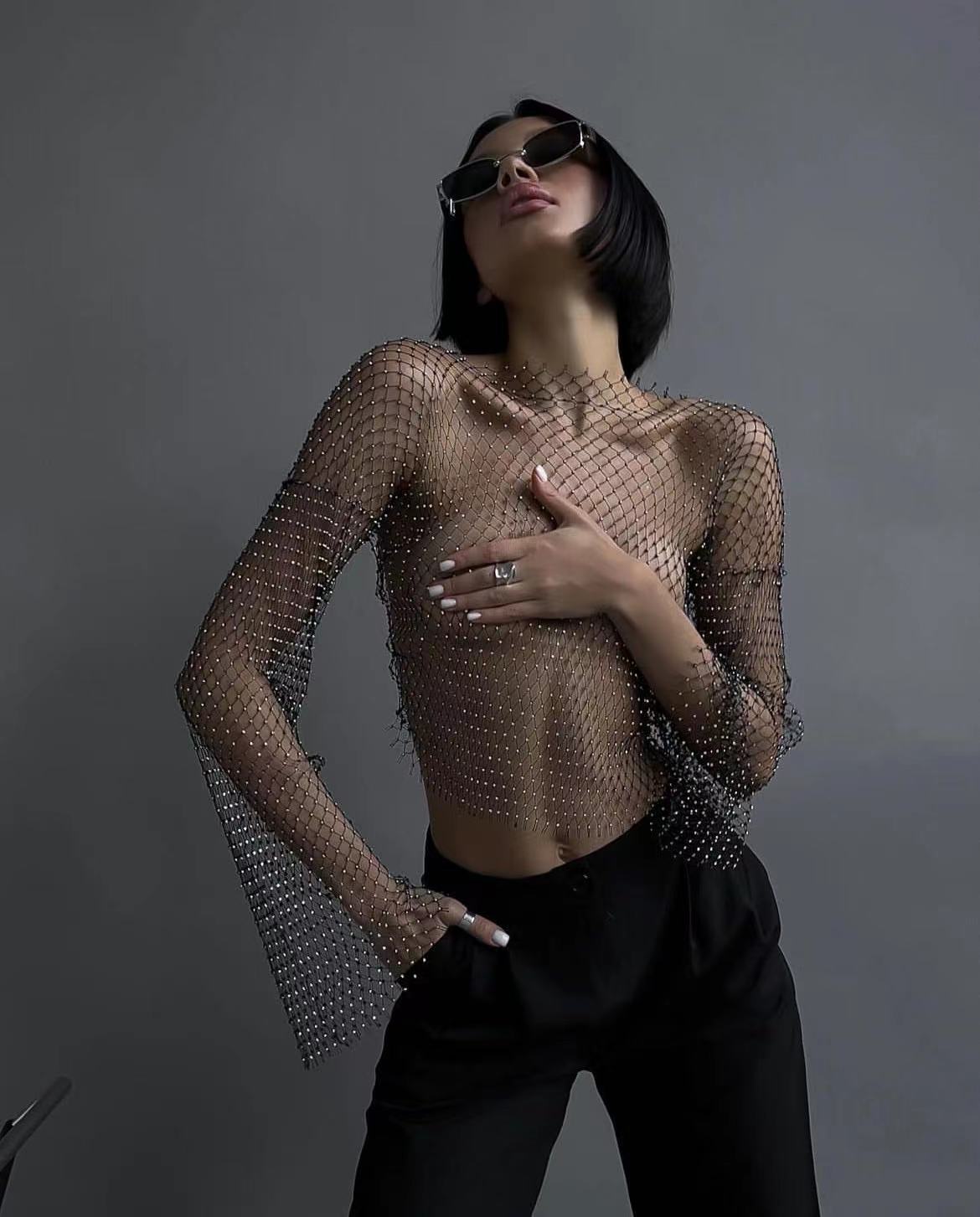Elevate your style with our trendy Diamond Mesh Top, designed to make heads turn wherever you go. Crafted with precision, this fashion-forward piece features a stunning water-diamond embellishment that catches the light, creating a dazzling effect. The long sleeves and v-neck design add a touch of elegance and sophistication, perfect for both casual outings and glamorous events.