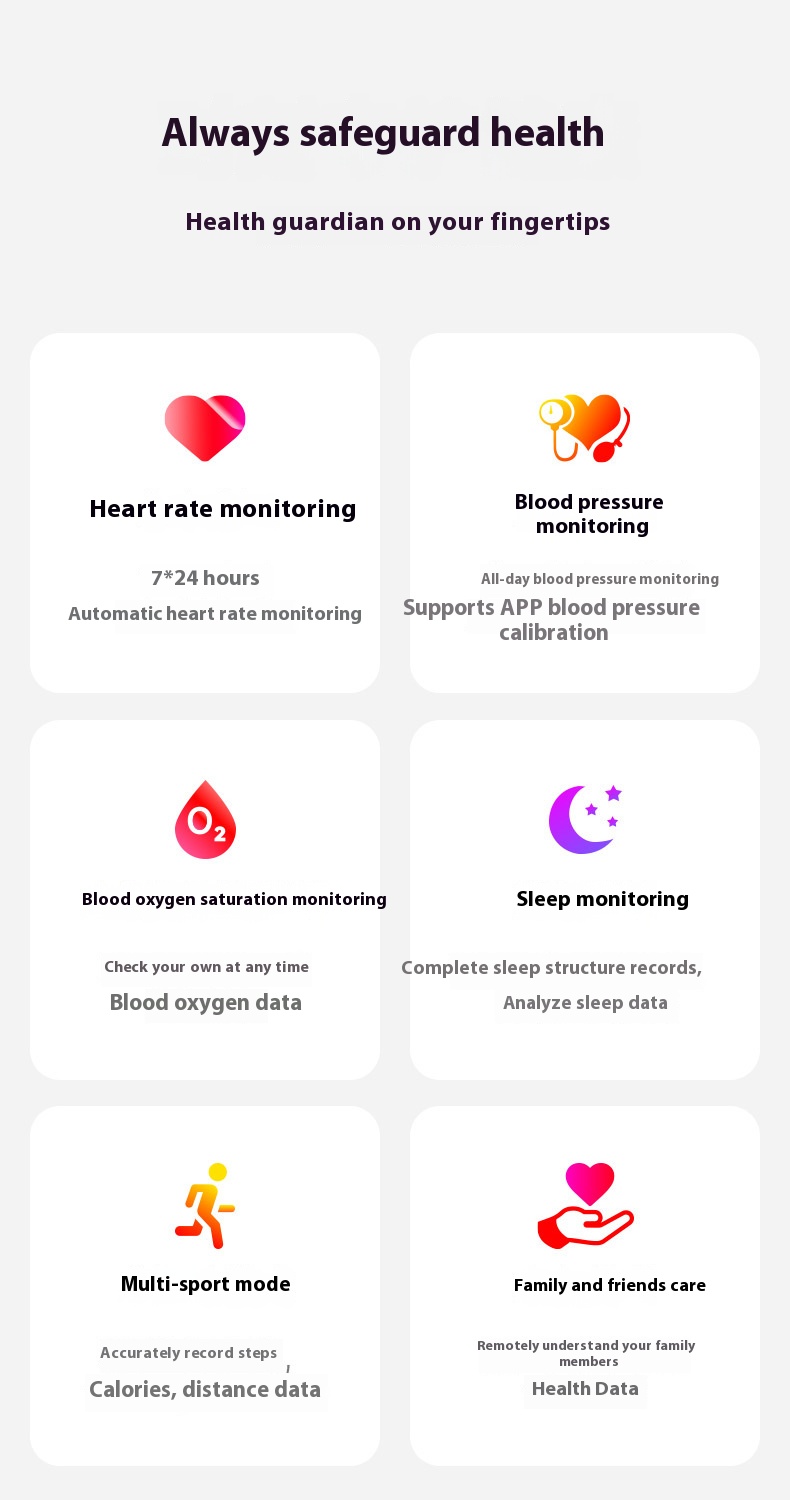 ❤️ Health Monitoring: Real-time heart rate, blood pressure, and blood oxygen levels, ensuring 24/7 health protection.